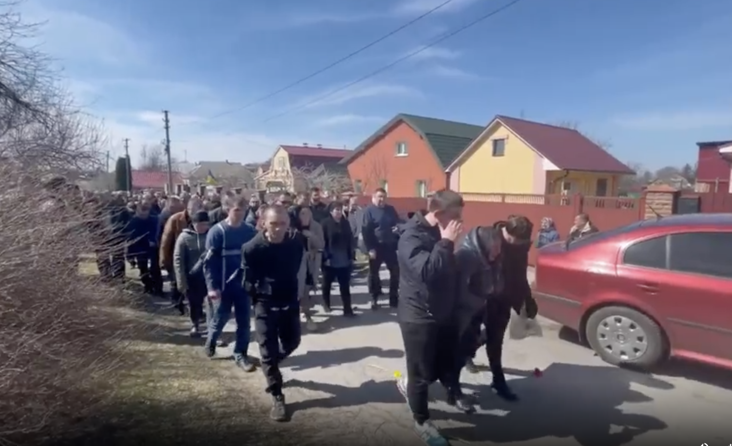 Vadym Tokar, kreu i këshillit të fshatit Makariv, postoi video në Telegram të banorëve lokalë që marshonin pas një furgoni që mbante arkivolet e Sukhenkos dhe burrit dhe djalit të saj, të cilët gjithashtu u vranë.