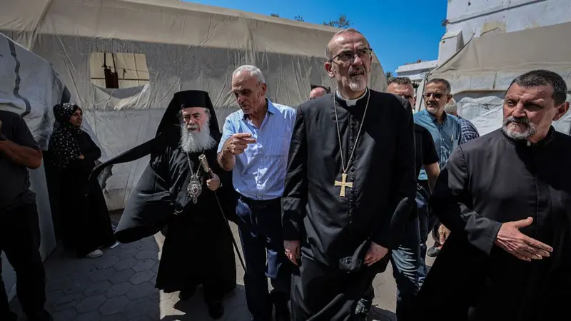 Dy burrat bënë një vizitë të rrallë në Rripin e shkatërruar nga lufta, pasi zjarri i tankeve izraelite goditi Kishën Katolike të Familjes së Shenjtë në qytetin e Gazës javën e kaluar, duke vrarë dy gra dhe një burrë.