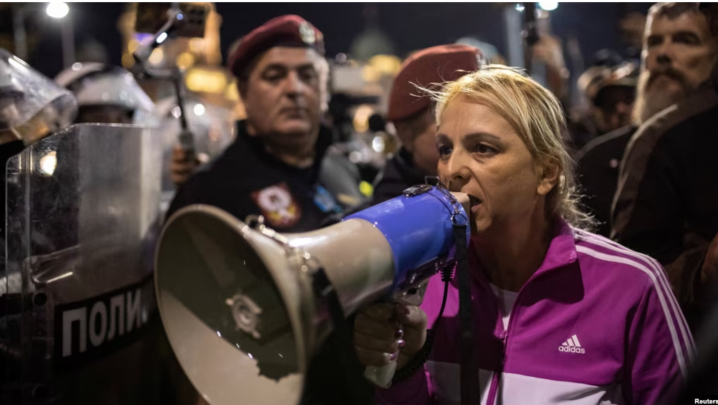 Përgjatë protestës, Dijana Hërka i është drejtuar policisë me megafon, duke thënë se ky institucion do të fajësohet për incidentet.