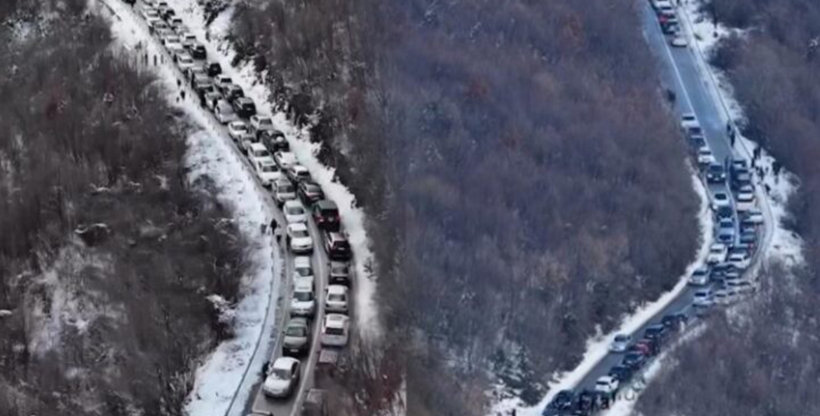 25 kilometra trafik: Pamje me dron nga qarkullimi i bllokuar në rrugët e Dajtit të zbardhur nga dëbora