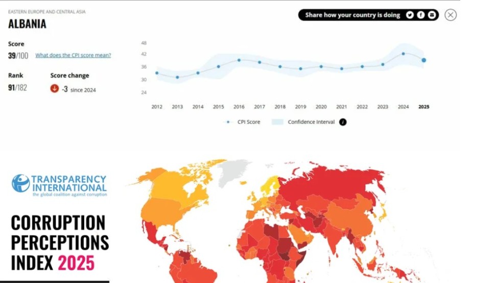 Nga 42 pikë që kishte në vitin 2024, ka përfunduar në 39 pikë në raportin e vitit 2025, duke humbur 3 pikë dhe rënë me 11 vende në renditjen globale të Transparency International. Në raportin e vitit të kaluar, Shqipëria renditej e 80 mes 180 vendeve, ndërsa sot vendi renditet i 91.