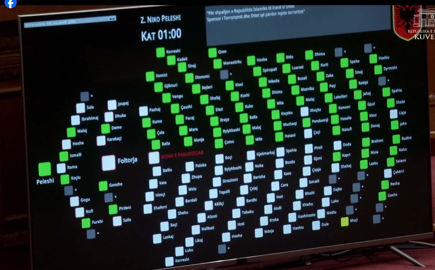 Me 79 vota pro, Kuvendi ka miratuar sot rezolutën që shpall Iranin shtet terrorist, duke marrë shkas dhe nga ngjarjet e fundit që po prekin Lindjen e Mesme dhe jo vetëm. Teksa në sallë mungonte opozita, e cila nuk pranoi të ishte pjesë e seancës së sotme, në Kuvend u votua për praninë, ku rezultuan 79 ligjvënës, të cilët votuan të gjithë pro miratimit të kësaj rezolute. Kjo rezolutë dënon politikat e Iranit, duke marrë shkas dhe nga fakti se ky shtet ka kryer disa herë sulme kibernetike drejt institucioneve të vendit tonë.