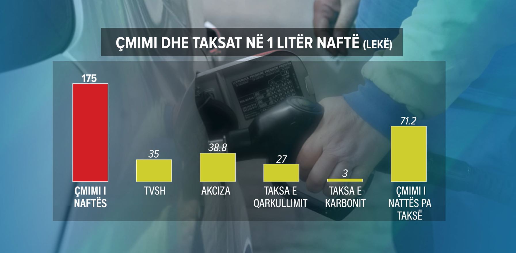 Në vendet e zhvilluara të OECD-së, taksimi është edhe më i ulët, rreth 40%–45%. Sot, shteti shqiptar për çdo litër nafte të shitur merr rreth 125 lekë taksë. Me fjalë të thjeshta, çdo qytetar shqiptar paguan rreth 1,200 lekë të vjetra taksë për çdo litër nafte që konsumon, duke e bërë Shqipërinë një nga vendet me barrën më të lartë fiskale mbi karburantin dhe si rrjedhojë, me një nga çmimet më të larta në Evropë. Për këtë arsye, Shqipëria ka sot karburantin më të shtrenjtë në Evropë, dhe në raport me fuqinë blerëse mbi dyfish krahasuar me vendet e rajonit. Ndryshe nga Shqipëria, vendet e BE-së dhe OECD-së ofrojnë shërbime publike të standardeve të larta, duke ua rikthyer bujarisht këto taksa qytetarëve të tyre në formë përfitimesh konkrete.