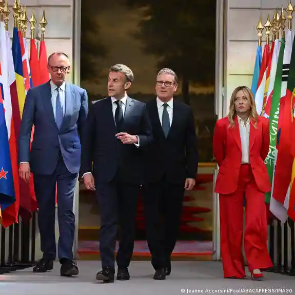 Presidenti i Francës Emmanuel Macron, kryeministri britanik Keir Starmer, kryeministrja e Italisë Giorgia Meloni dhe kancelari gjerman Friedrich Merz dolën para mikrofonëve së bashku në Paris. Paraqitja e përbashkët kishte për qëllim të dërgonte një sinjal të unitetit evropian. Megjithëse Irani sërish kërcënoi me bllokim të ri, Macron e përshëndeti fillimisht njoftimin e Iranit për hapjen e Ngushticës së Hormuzit për kohëzgjatjen e armëpushimit, por theksoi se kjo nuk ishte e mjaftueshme.